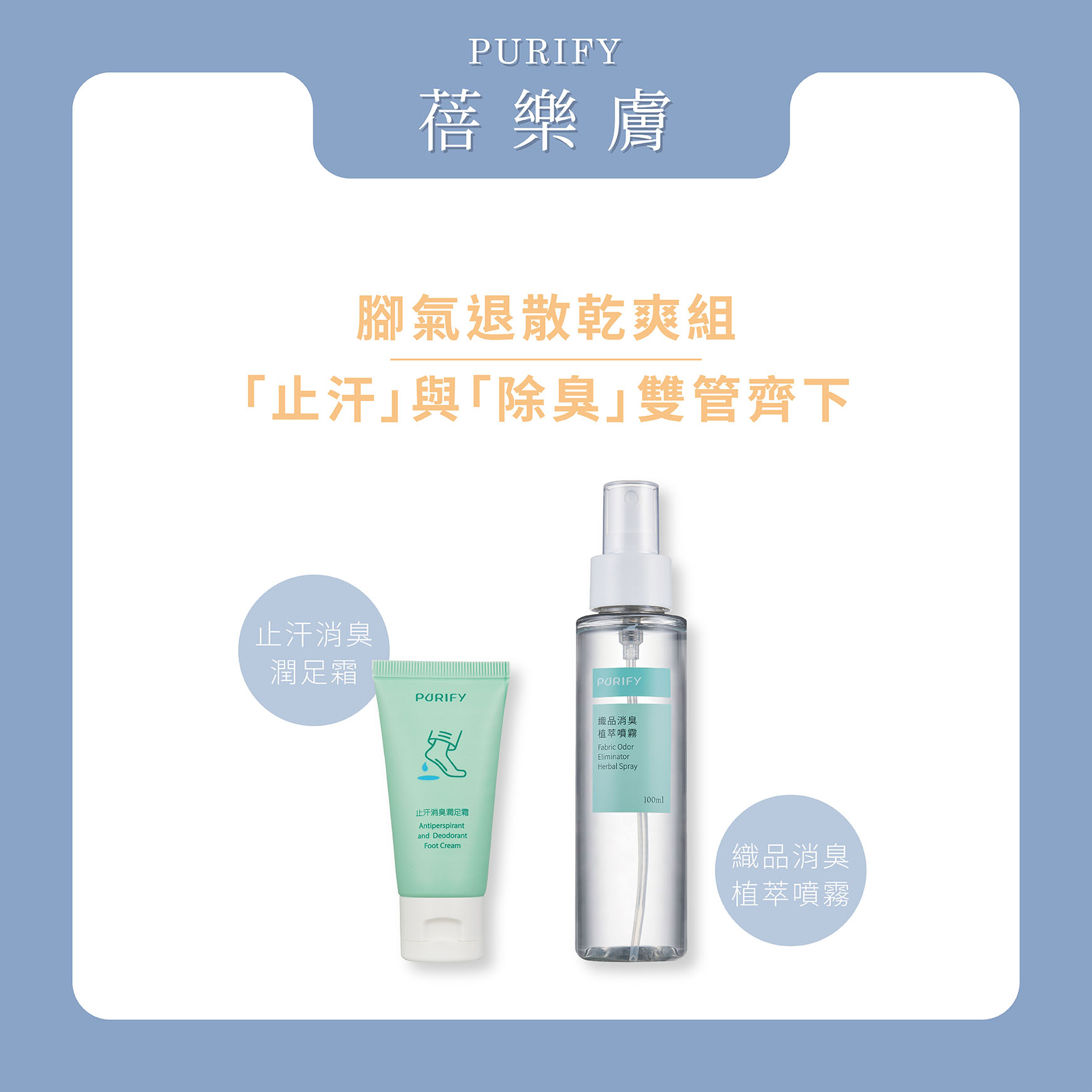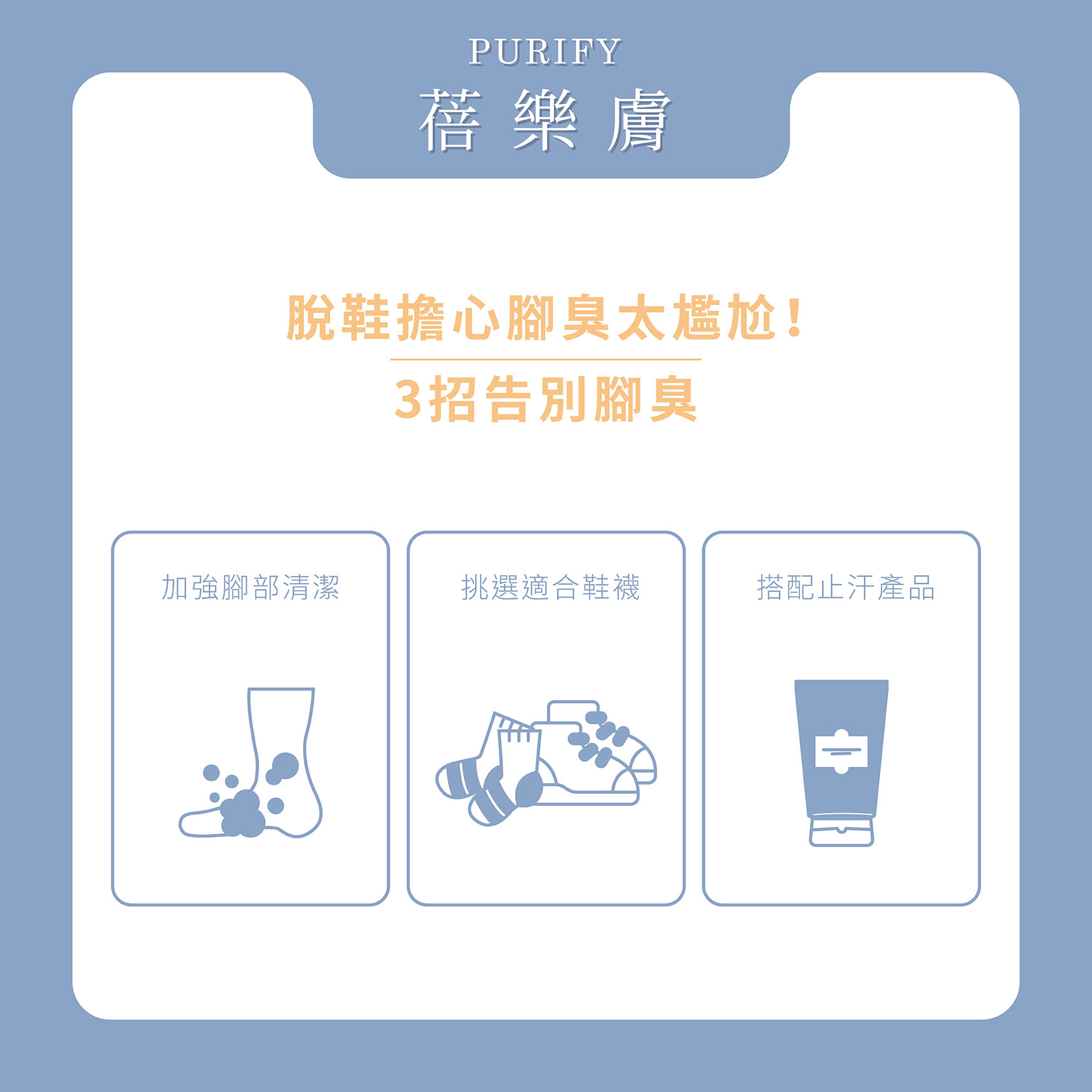 腳部汗腺較發達,一般的止汗噴霧效果可能較不顯著。我們強烈建議選擇止汗效果更為顯著、不易脫落的足部專用止汗產品,才能有效抵擋長時間的出汗情況。 PURIFY 蓓樂膚 止汗消臭潤足霜正是您的最佳選擇!