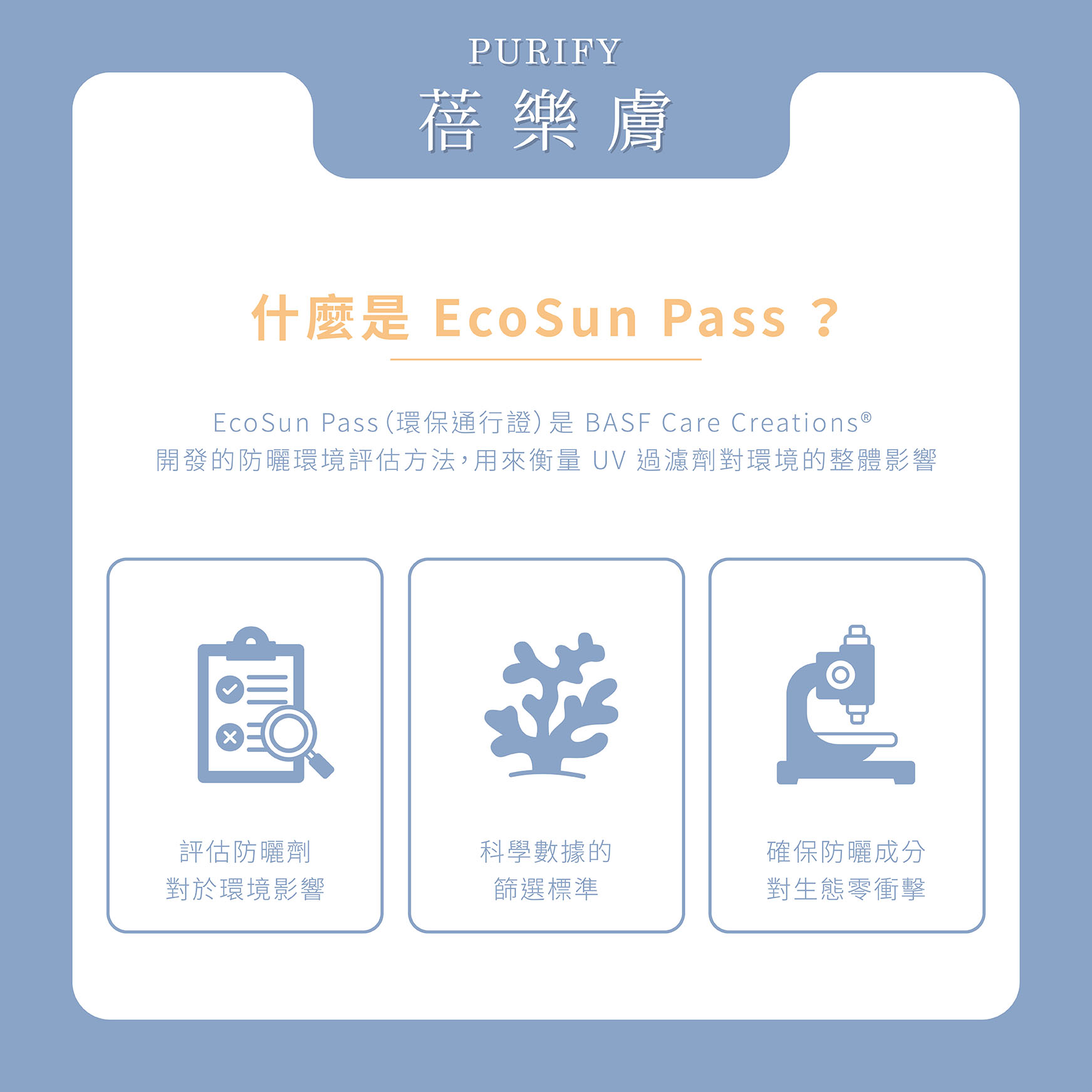 那麼,什麼是【EcoSun Pass】潔淨標準?【EcoSun Pass】是國際防曬權威巴斯夫(BASF),專為防曬所開發環境友善指數評估的全新方法,主要是使用最新的科學數據,評估防曬劑對於環境影響,以及防曬係數(SPF)和UVA防護效率,是否能夠達到最佳的環境足跡,讓消費者在選擇環保的防曬這件事變得更簡單。