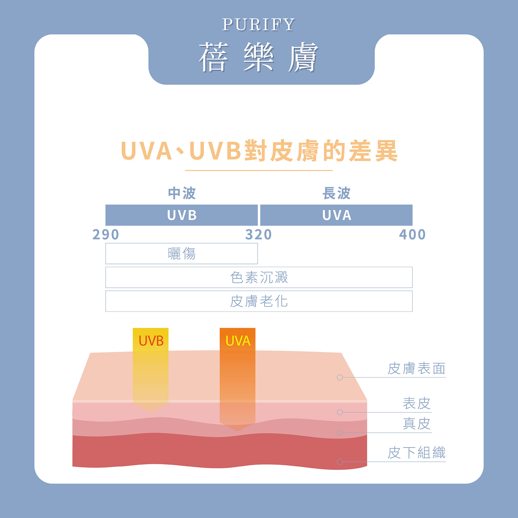 UVA | 會導致皮膚老化、曬黑、產生皺紋、促使光老化、增加皮膚癌風險 | 作用於皮膚深層;不易被玻璃與雲層阻擋,全年都存在 |