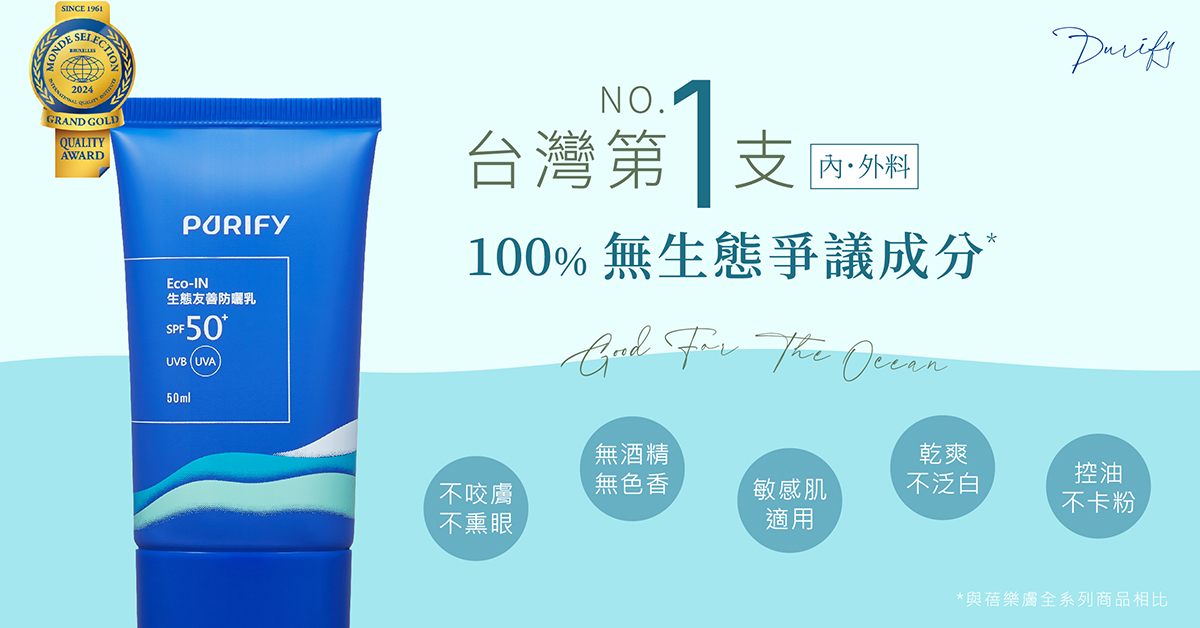 蓓樂膚ECO-IN生態友善防曬乳(按此進入了解商品),SPF50+,100%礦物防曬,水下牢固不脫落配方,讓您在日常與海灘嬉戲時,安心防曬與保持海洋健康。