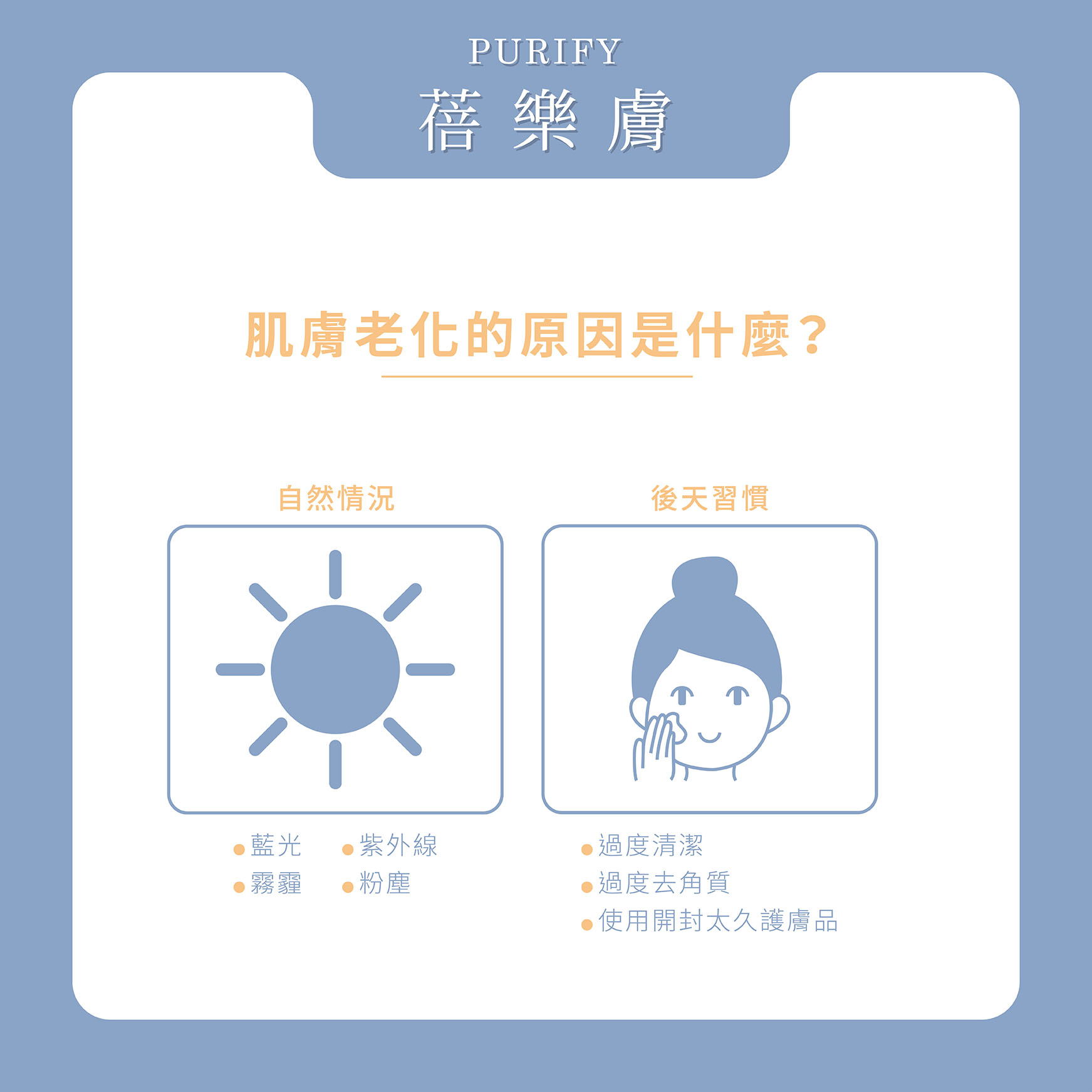 外源性老化 | 因肌膚曝露於環境中,環境中的各種因素,包含紫外線UVA、UVB、霧霾、地心引力、不當的保養方式等因素,其中光老化占臉部老化80%的因素,因此建議一定要做好防曬。 |