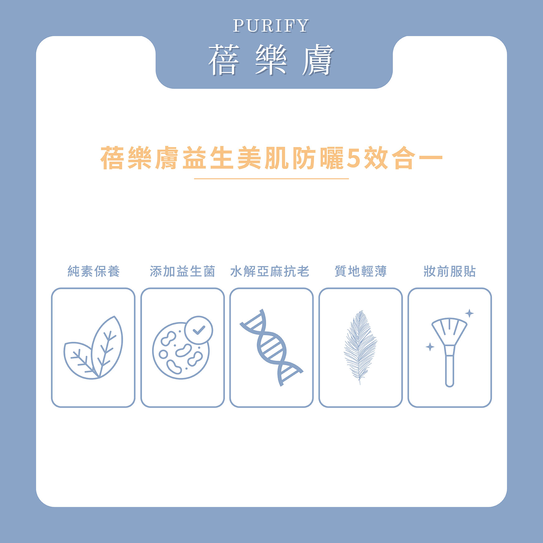 蓓樂膚PURIFY首推添加日本專利益生菌的益生美肌防曬乳SPF 50+,結合最新科研、運用三重益生技術,突破防曬極限,打造出防曬力、防禦力、抗老力、修護力和保養力,尤其對於台灣女生最在意的「妝前打底」更是有高水準的表現。