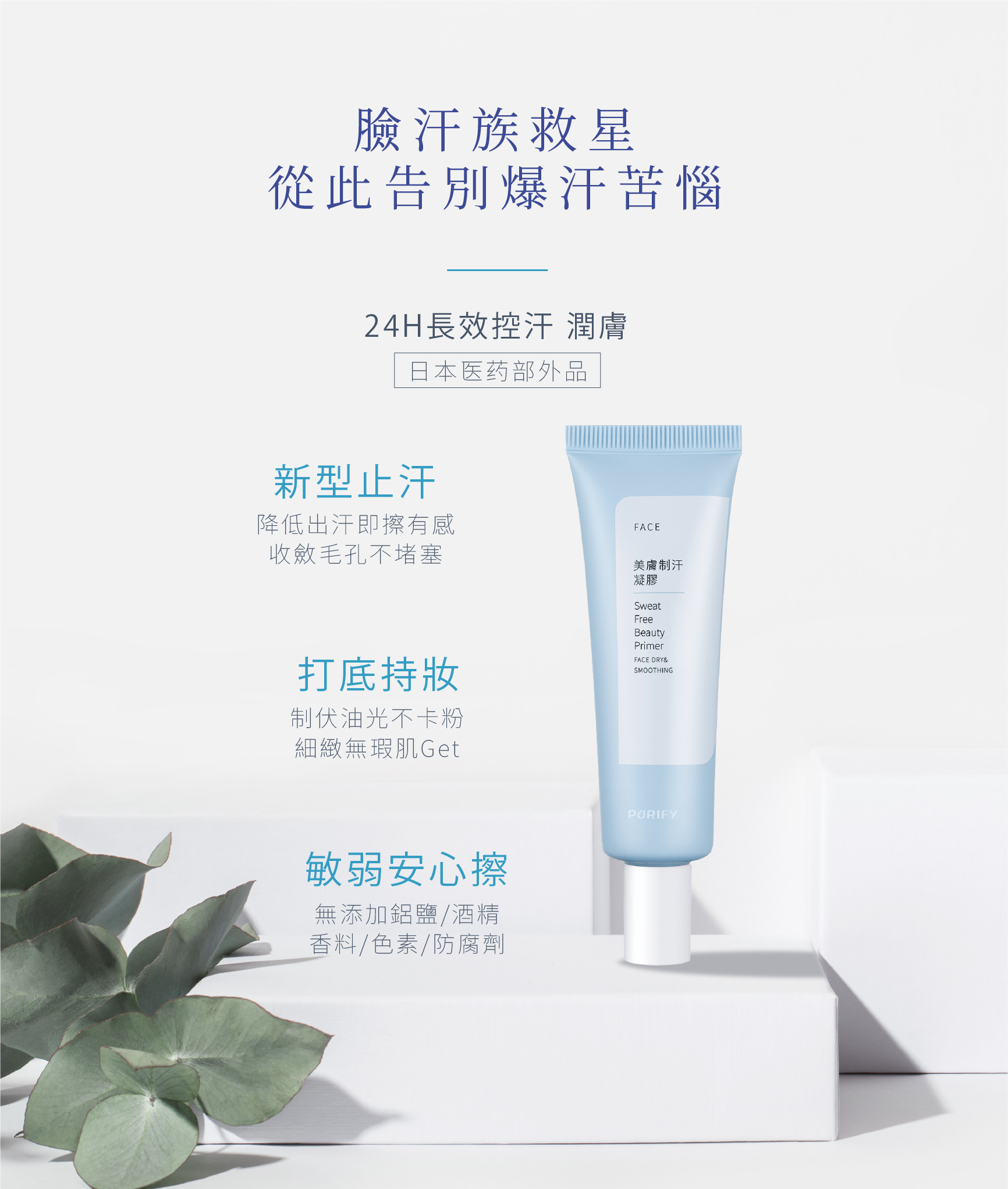 新上市的美膚制汗凝膠是採用的新型止汗技術,採用苯酚磺酸鋅吸附汗水、收斂毛孔,達到降低出汗與出油效果,無添加鋁鹽使用上更簡單方便,出門前後都可隨時補擦,達到更好的持妝效果。