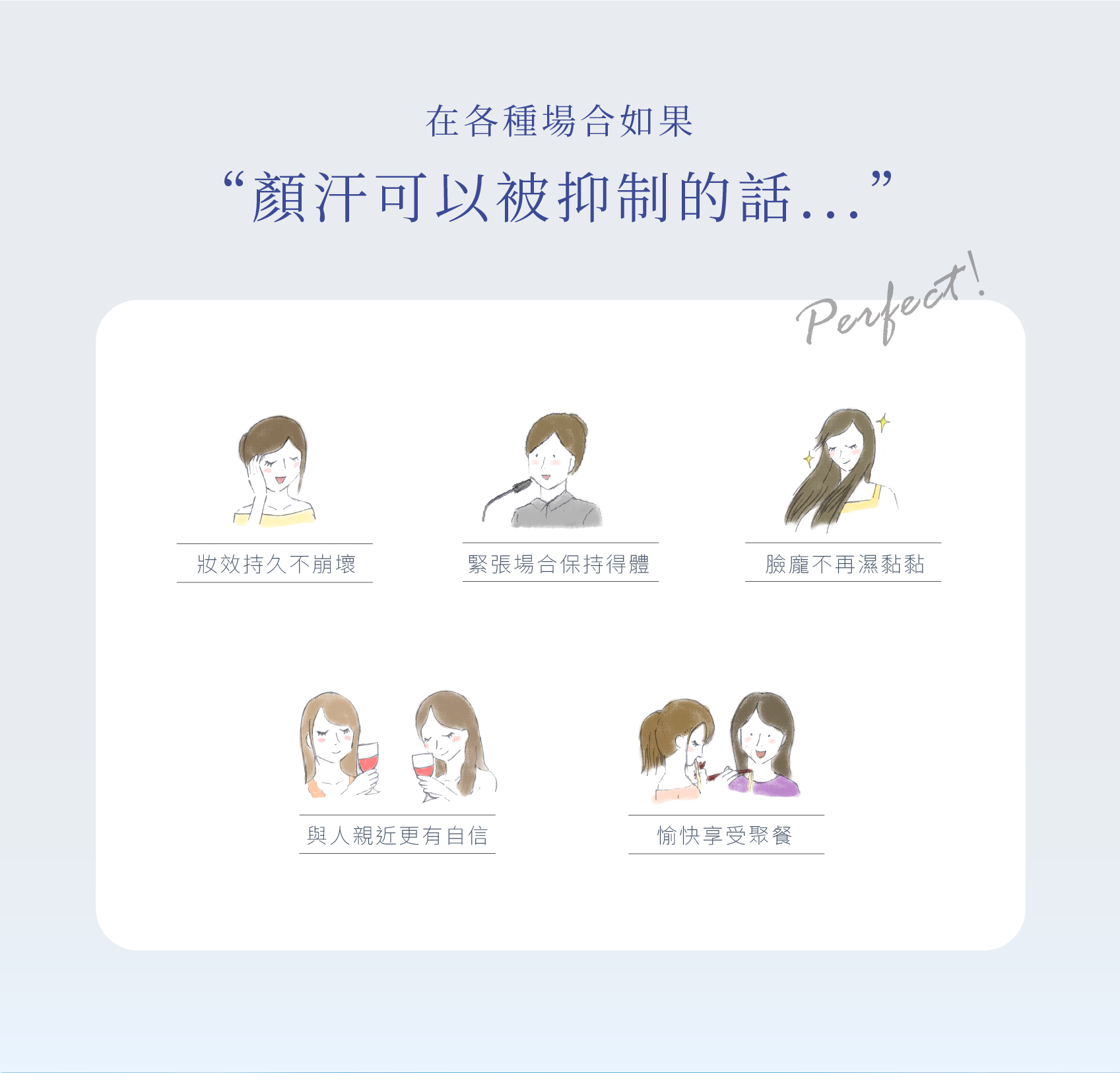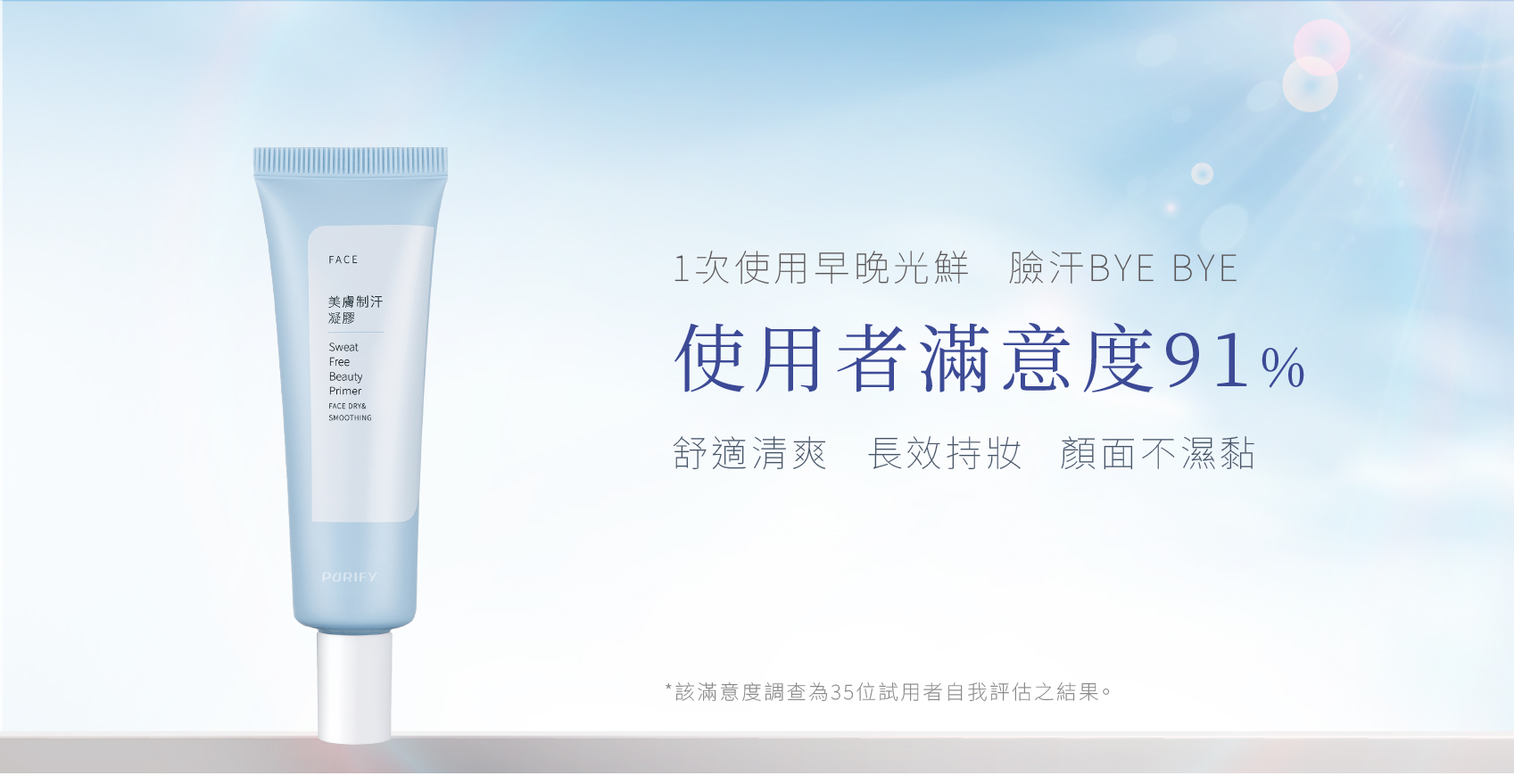 完成清潔保養程序後,取1-2cm大小量集中塗抹於易出汗的地方,臉部出汗量較大者,可視自身情況以「點狀按壓」平鋪的方式,加強補擦於易出汗處,並搭配疊撲蜜粉,效果更佳。