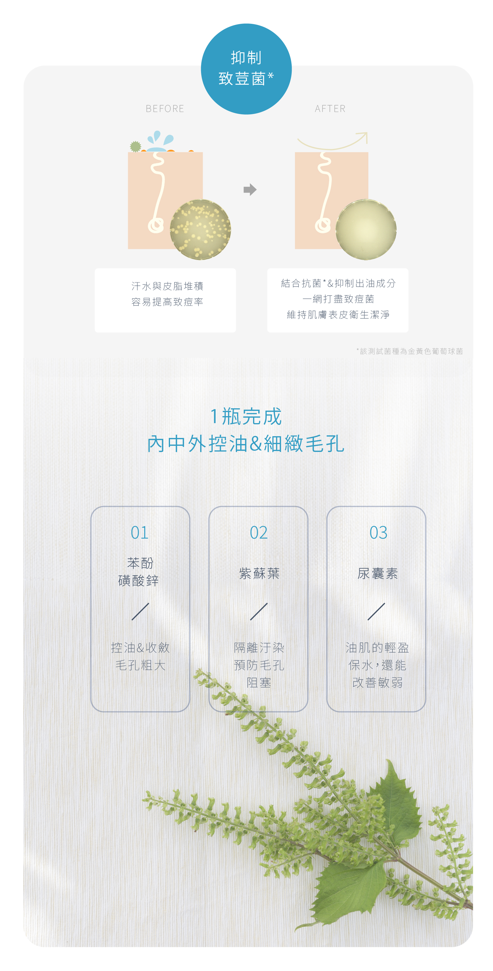 美膚制汗凝膠主要是透過吸苯酚磺酸鋅收斂毛孔大小、吸附汗水,藉此降低臉汗的發生率,結合抗菌、抑制出油的成分,可以防止皮脂組塞毛孔,使致荳菌難以生存,長效維持肌膚表皮衛生潔淨。