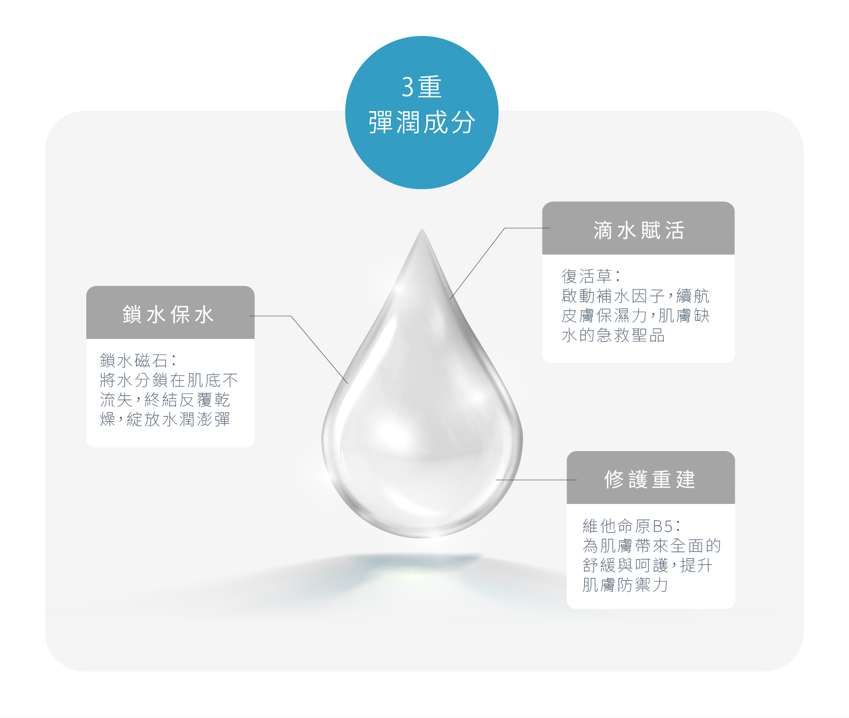 全成份:Aqua, Cyclopentasiloxane, Propanediol, Dimethicone, Isododecane, Disiloxane, Coco-Caprylate/Caprate, PEG-9 Polydimethylsiloxyethyl Dimethicone, Zinc Phenolsulfonate, PPG-17/IPDI/DMPA Copolymer, Caprylyl Methicone, Disteardimonium Hectorite, PEG/PPG-10/30 Copolymer, Sodium Chloride, Saccharide Isomerate, Dimethicone/Vinyl Dimethicone Crosspolymer, Panthenol, Selaginella Lepidophylla Extract, Menthyl Lactate, Polyglyceryl-2 Dipolyhydroxystearate, Allantoin, Dimethicone/PEG-10/15 Crosspolymer, O-Cymen-5-ol, Maltodextrin, Arginine, Ascorbyl Glucoside, Lactobacillus Ferment, Sodium Citrate, Citric Acid, Dipropylene Glycol, Perilla Frutescens Leaf Extract, Tocopherol 添加成分: 維生素原B5、復活草萃取、尿囊素、精氨酸、乙基維生素C、乳酸菌發酵物、白蘇葉提取物、維生素E