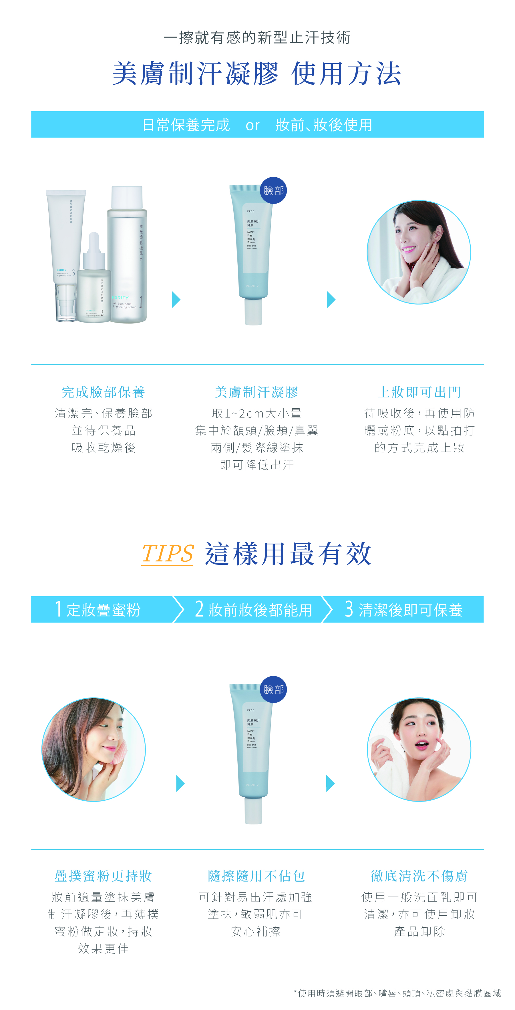 方式:擦拭完安瓶後,待肌膚上有點油感時,直接在臉上輕鋪一層美膚制汗,切勿搓揉,讓凝膠自然在臉上做風乾,直接去睡美容覺,隔天一早以清水潑溼臉部,衛生紙輕拍輕潔,即可達到最佳止汗效果。