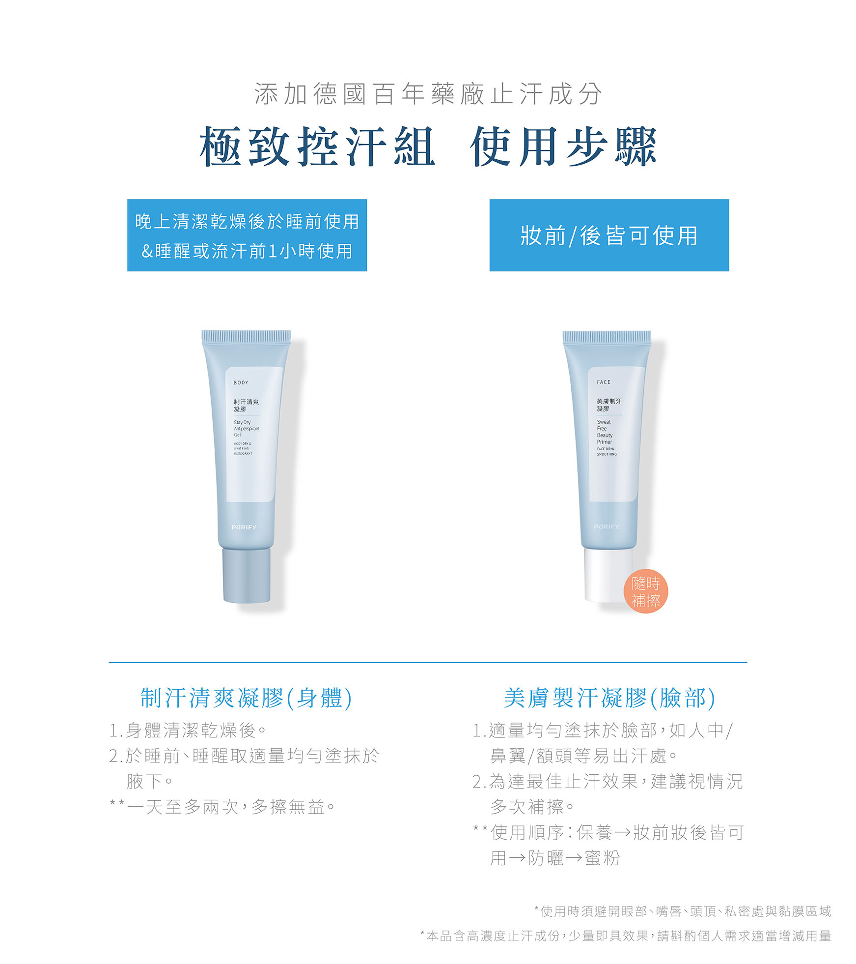 1. 身體用【制汗清爽凝膠】:需於身體洗淨後,在無出汗的情況下塗抹,一天最多兩次即可,多擦無異。身體因出汗量較大,採用德國百年藥廠止汗成分,符合國家安全法規鋁鹽Aluminum Chlorohydrate。 I. 使用部位:針對腋下、背部、胸部、手心、腳底 II. 使用時機:建議每日清潔後於「睡前」、「早上起床」一天最多兩次即可哦。 III. 使用方式:先清潔欲止汗的身體部位,一定要在乾爽狀態下塗抹才有用喔,待確認已完全乾燥後,在取1-2cm大小,均勻塗抹直到完整吸收 ※TIP:尤其又以洗澡後,提前一夜塗抹可達最高效果。若遇到臨時出門的情況,建議可以提早30-60分使用。 ※手腳汗因汗腺豐富,屬於最容易出汗處,建議可以搭配【乾爽止汗護手霜】、【止汗消臭潤足霜】隨時補擦加強控汗,才能達到最佳效果喔!