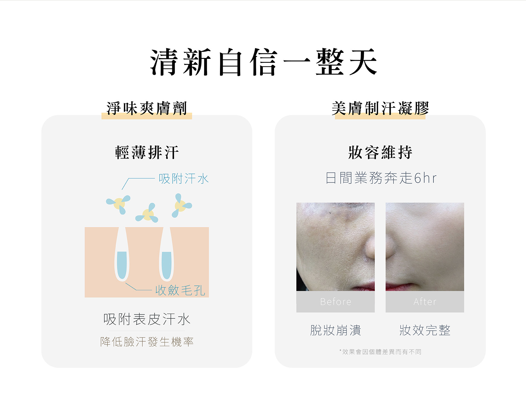※美膚制汗凝膠無潤色功能,一整天反覆疊擦也不怕會出現厚重的粉感,不愛化妝的素顏派,或是不喜歡臉上黏膩感的男士都可以安心使用。