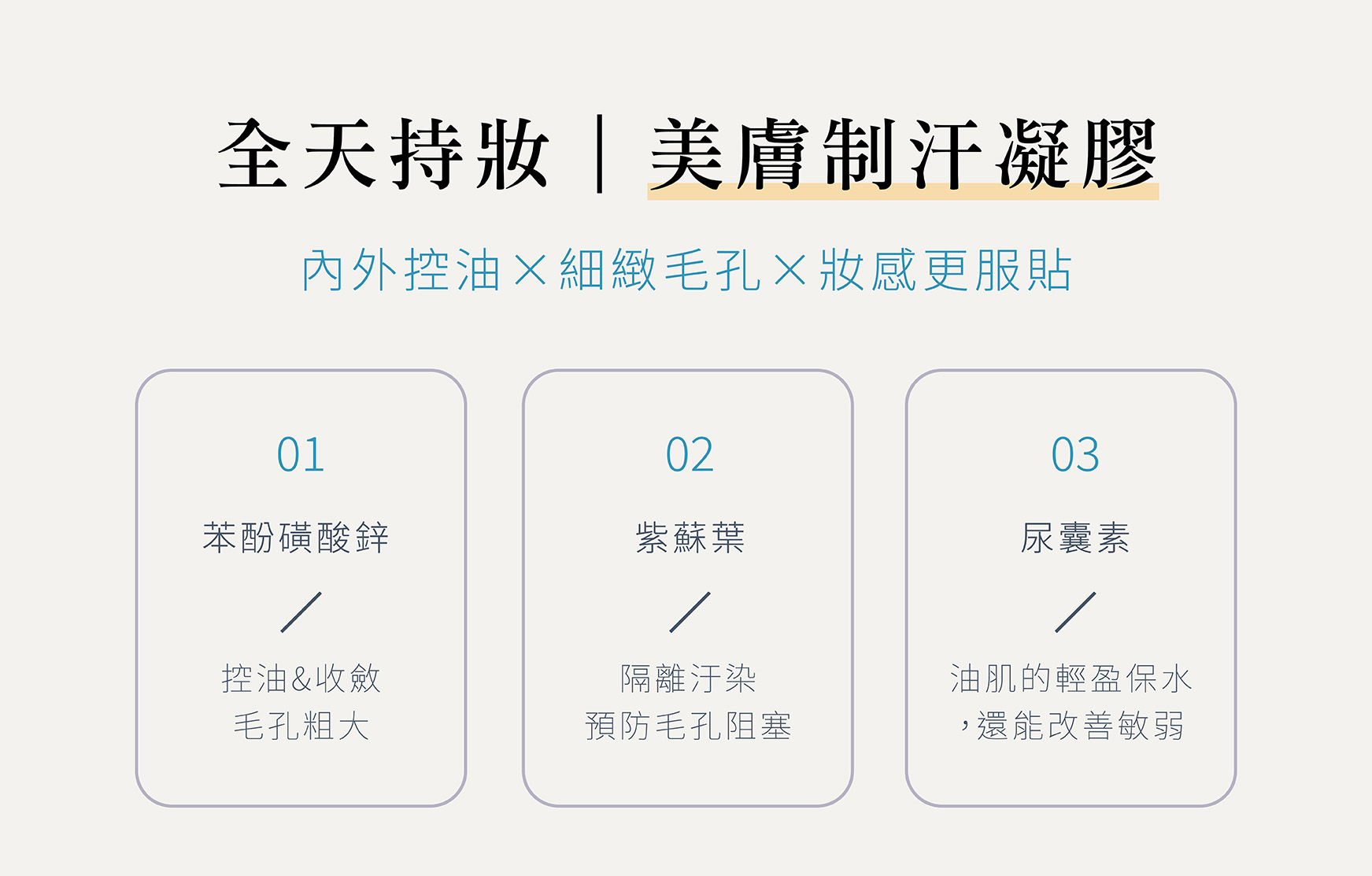 美膚制汗凝膠主要是透過吸苯酚磺酸鋅收斂毛孔大小、吸附汗水,藉此降低臉汗的發生率,結合抗菌、抑制出油的成分,可以防止皮脂組塞毛孔,使致荳菌難以生存,長效維持肌膚表皮衛生潔淨。