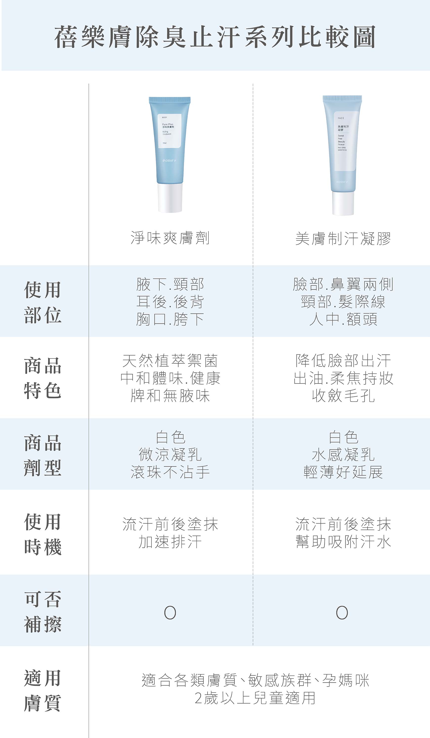 ◆ 臉部與腋下雙效控汗控臭,全天清爽不悶熱