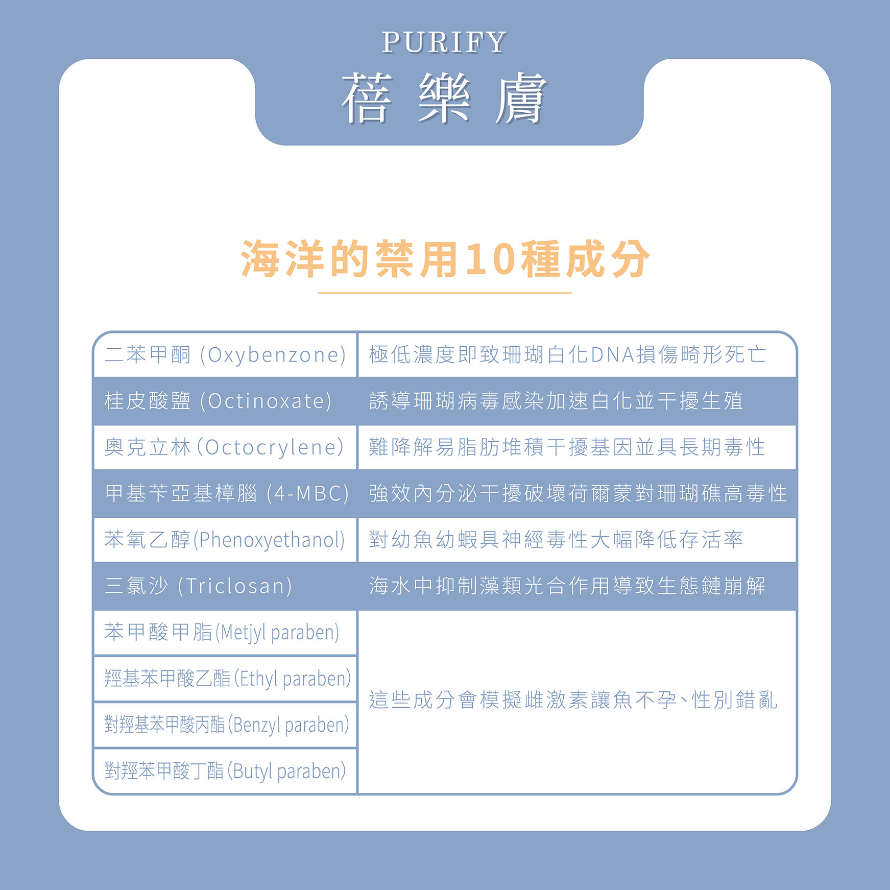 一般市售「海洋友善防曬」是指沒有添加海洋的禁用成分,但友善標準會依循不同國家的法規有不同的限制,其中最嚴格的為帛琉標準,禁用10種成分以及所有化學型防曬;泰國禁用4種成分,夏威夷則為2種。
