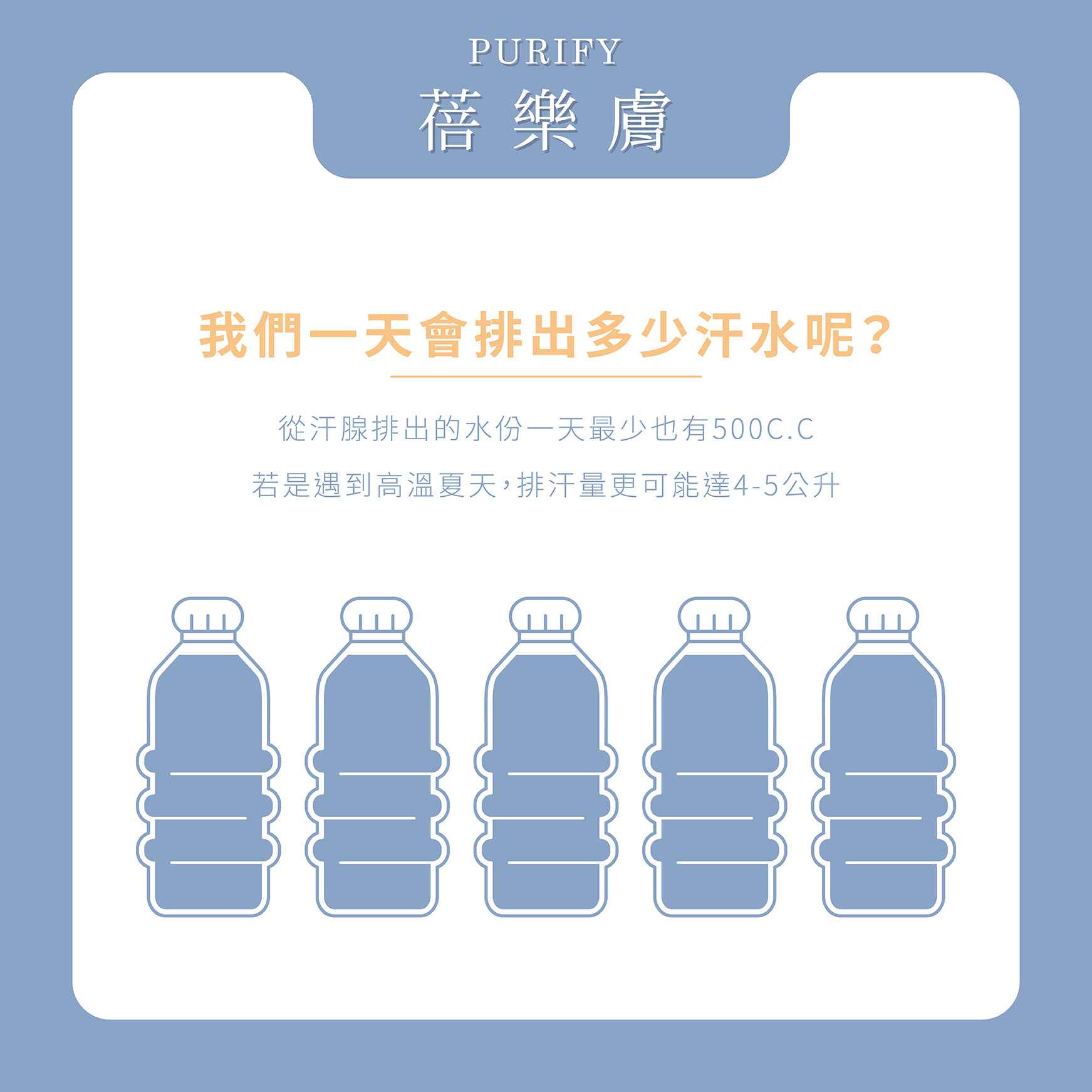其實我們人一天無時無刻都在分泌汗水,即使躺著不動,從汗腺排出的水份一天最少也有500C.C,若是遇到高溫夏天,排汗量更可能達4-5公升!