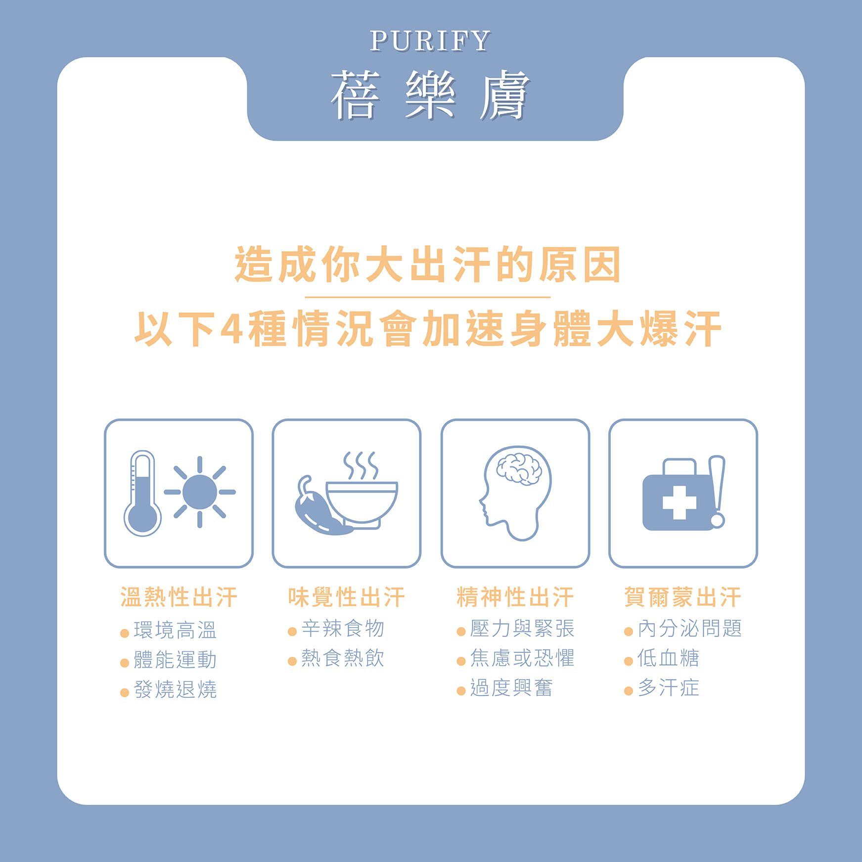 溫熱性出汗 | 氣溫太高、穿衣過厚、勞動運動、感染發燒 |