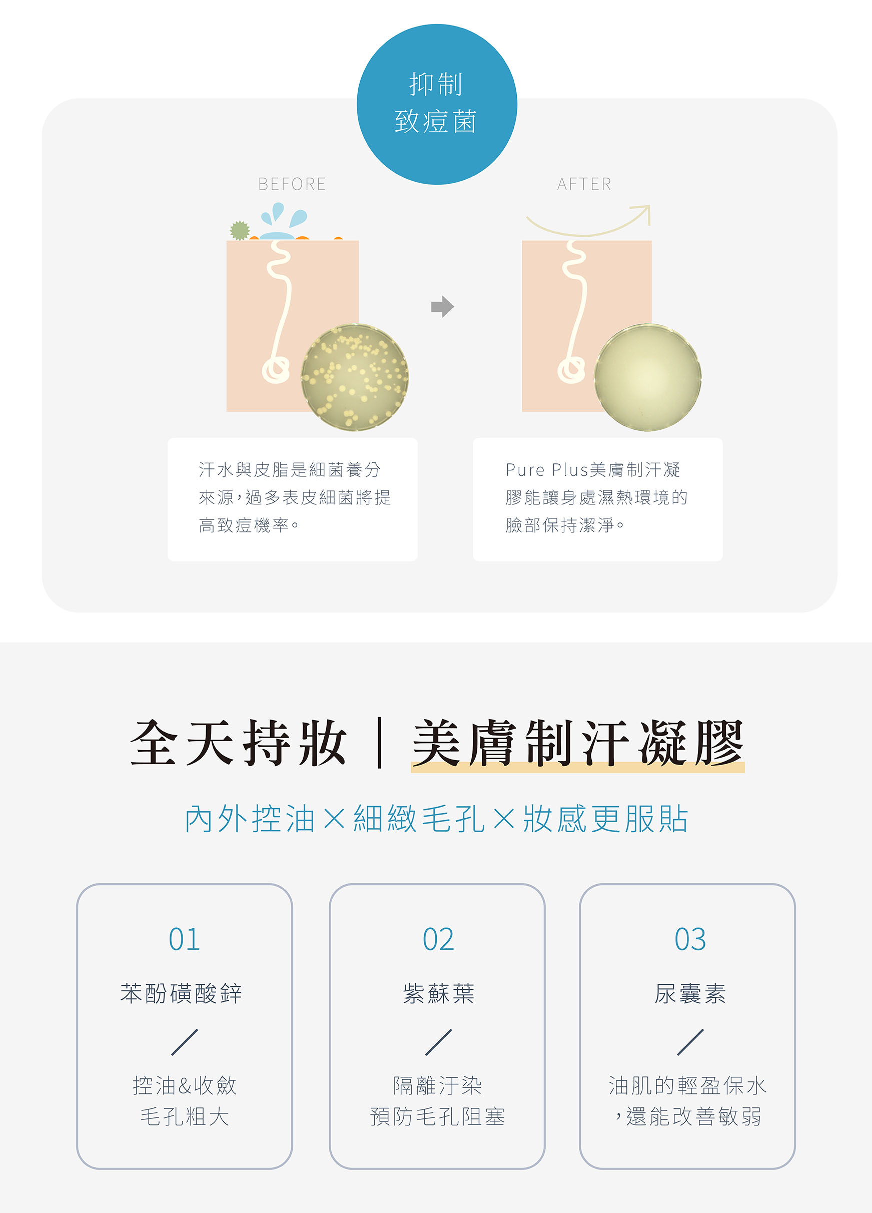 美膚制汗凝膠主要是透過吸苯酚磺酸鋅收斂毛孔大小、吸附汗水,藉此降低臉汗的發生率,結合抗菌、抑制出油的成分,可以防止皮脂組塞毛孔,使致荳菌難以生存,長效維持肌膚表皮衛生潔淨。