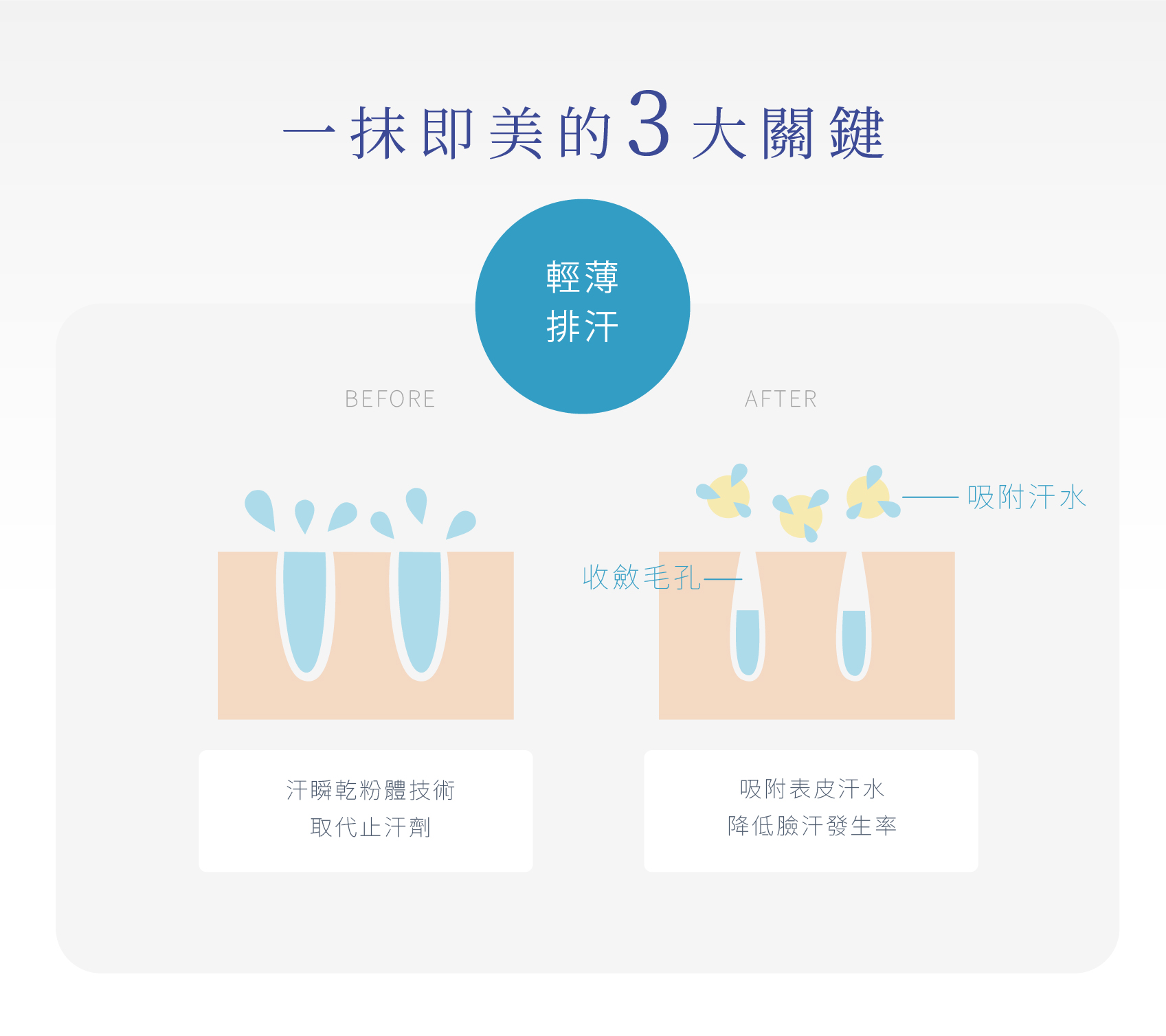 完成清潔保養程序後,取1-2cm大小量集中塗抹於易出汗的地方,臉部出汗量較大者,可視自身情況以「點狀按壓」平鋪的方式,加強補擦於易出汗處,並搭配疊撲蜜粉,效果更佳。