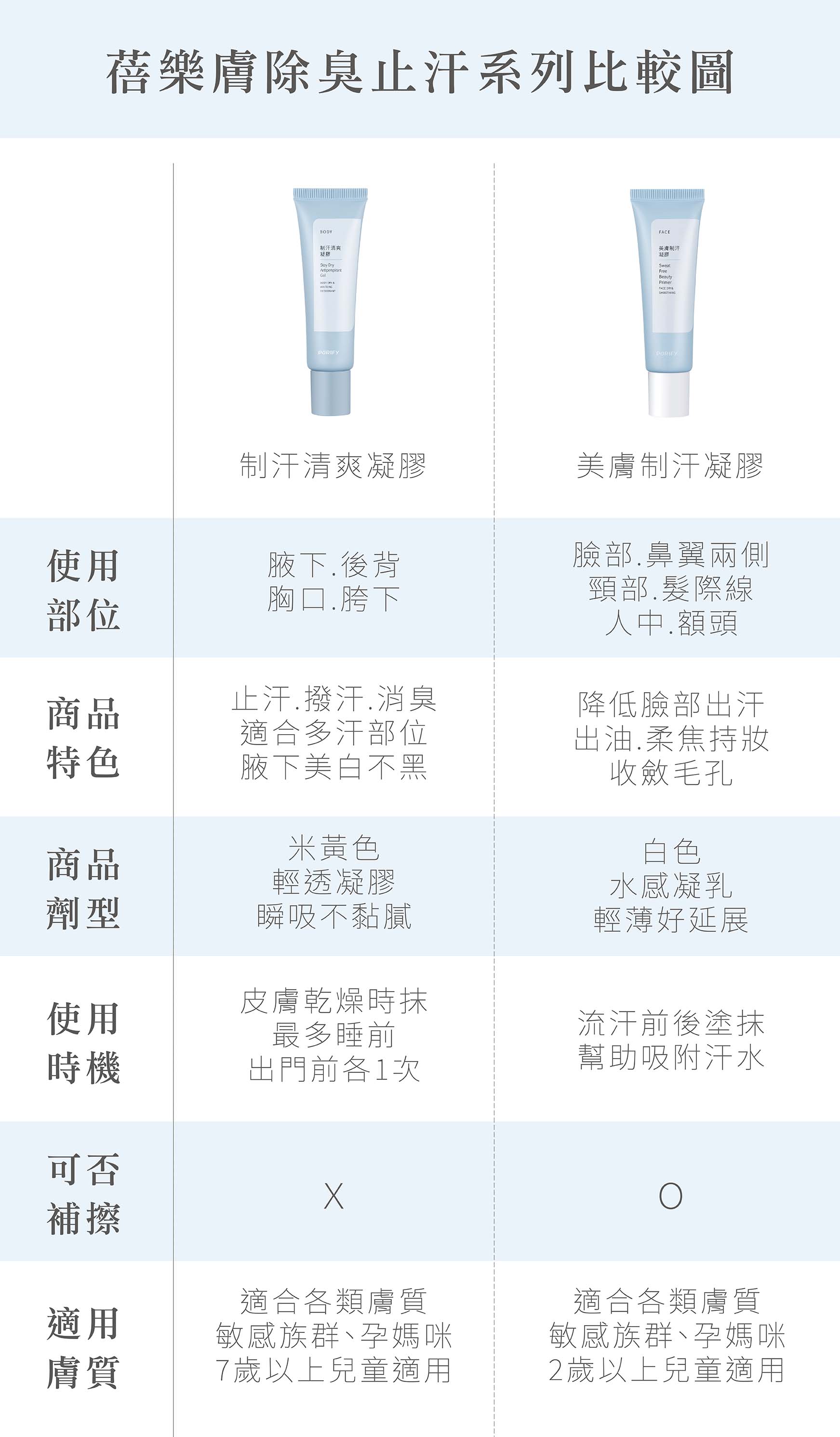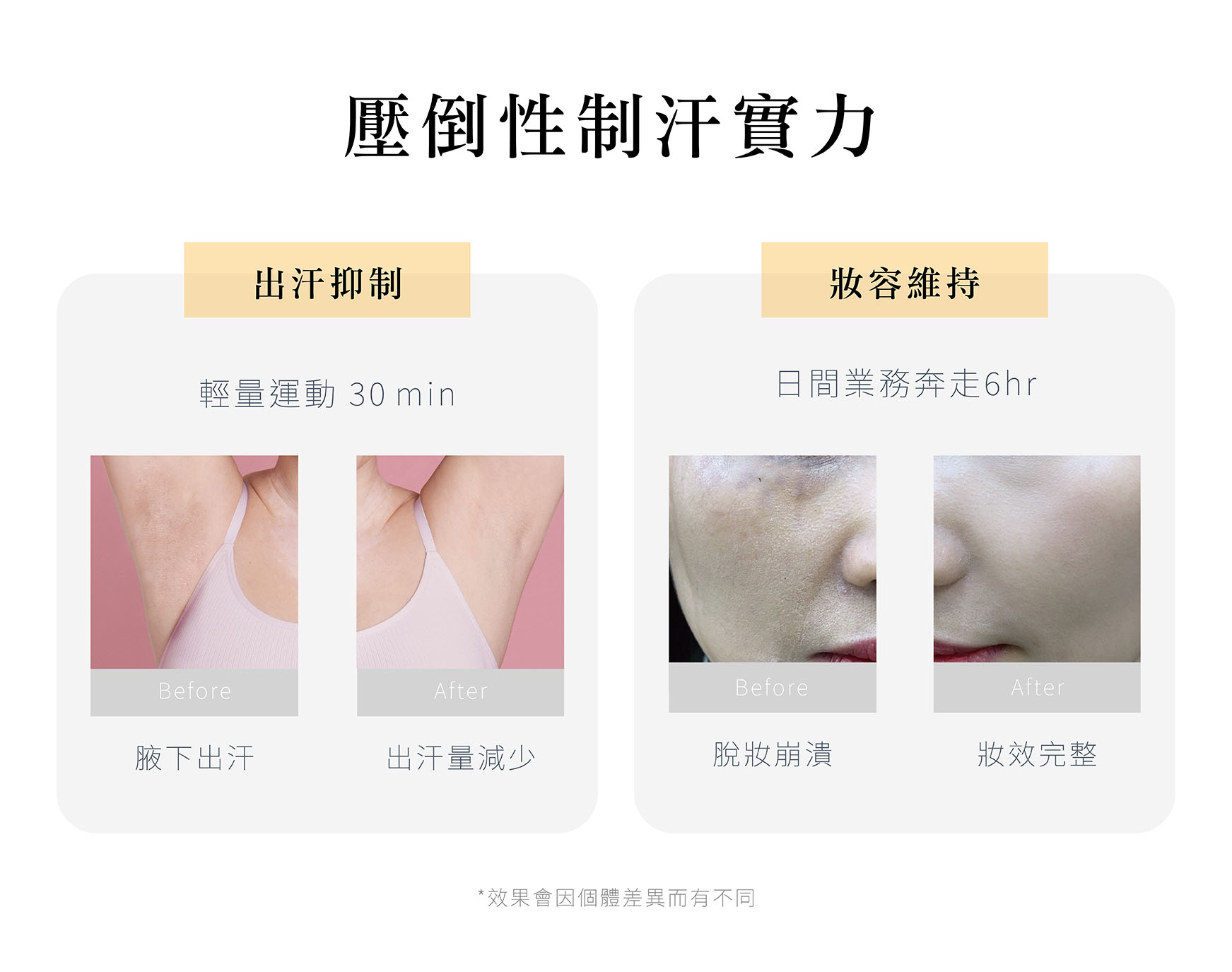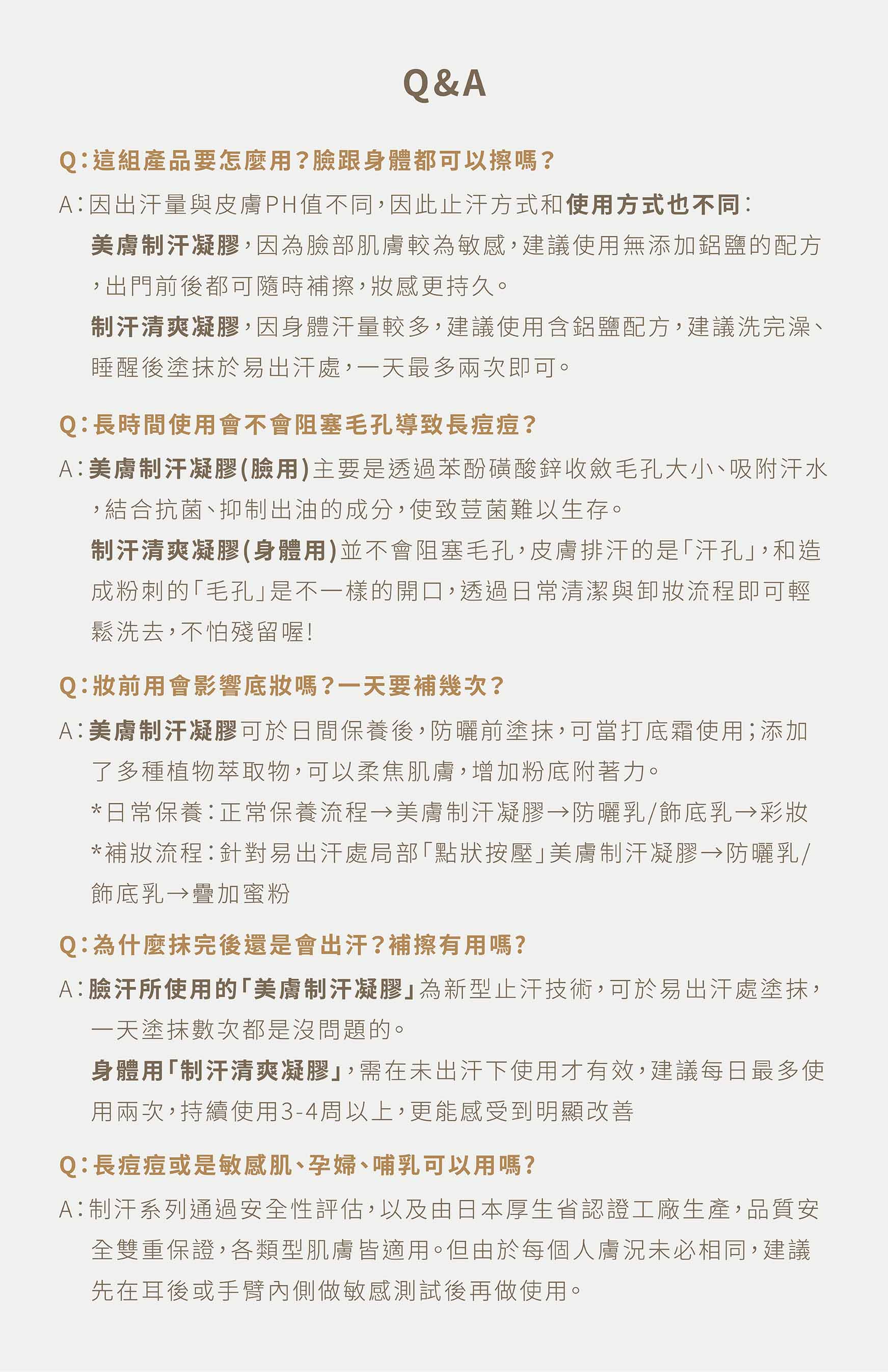 I. 使用部位:針對人中、髮際線、如額頭、臉頰、鼻翼兩側、人中等處做塗抹。 ※頭皮或是黏膜處不建議塗抹喔。 II. 使用時機:可視出汗情況於妝前、妝後加強塗抹於易出汗處。 III. 使用方式: 洗臉-保養品-美膚制汗-防曬-上妝 於臉部清潔後取1-2cm大小,均勻塗抹欲改善的地方直到完整吸收 ※即使臉部出汗量大,也不建議使用止汗濃度較高的【制汗清爽凝膠】塗抹於臉部,以免過度刺激。