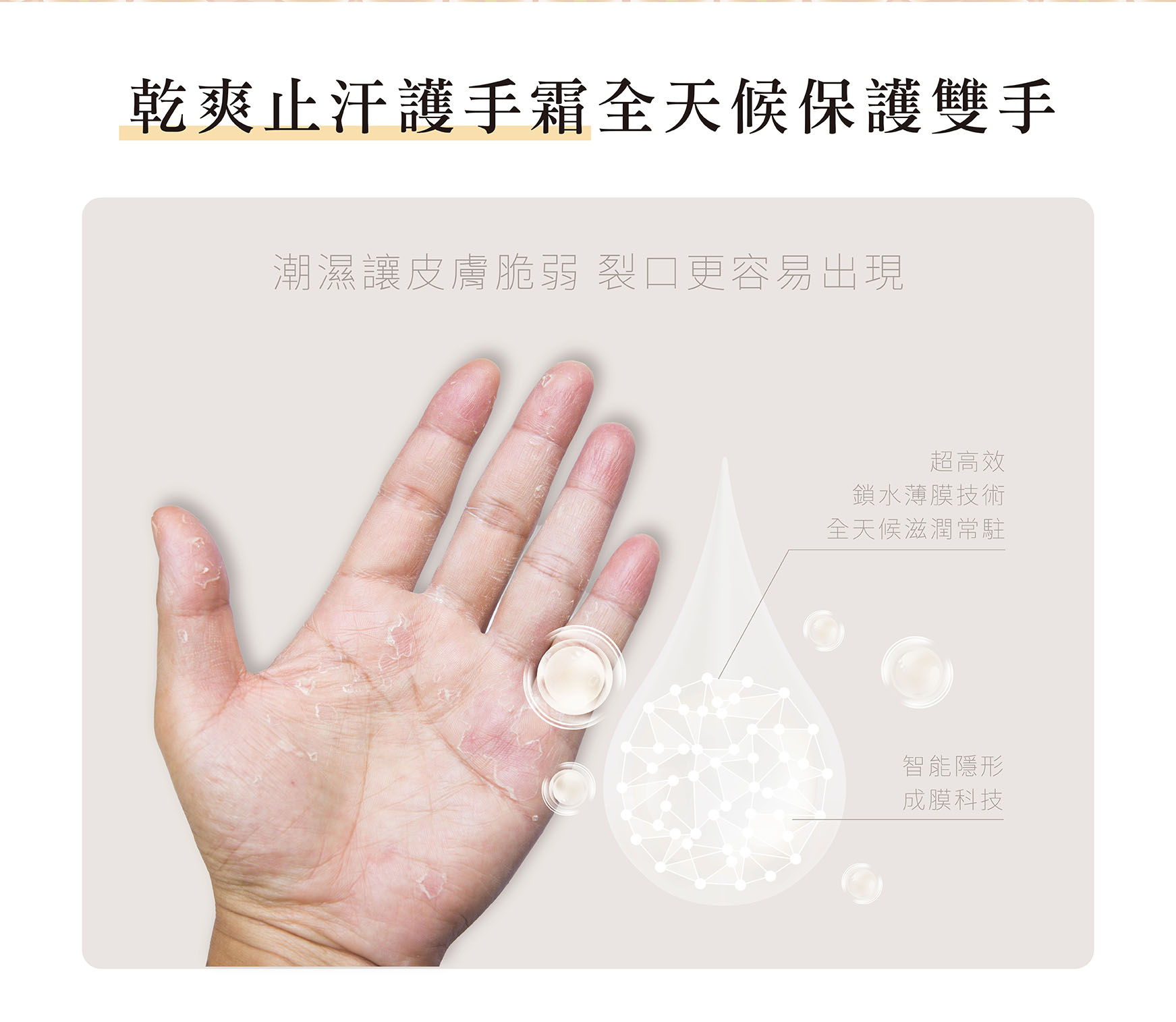 乾爽止汗護手霜是與經常接觸洗劑、飽受「富貴手」困擾的髮型師意見所開發。「富貴手」是一種常見的手部皮膚問題,通常會出現乾燥、脫皮、龜裂、發紅、發癢等症狀,若是反覆酒精消毒,或是接觸清潔劑、洗碗精等清潔用品都可能加劇情況。使用步驟建議宜遵循醫囑先擦藥膏,等待15至30分鐘後再擦護手霜加強呵護。