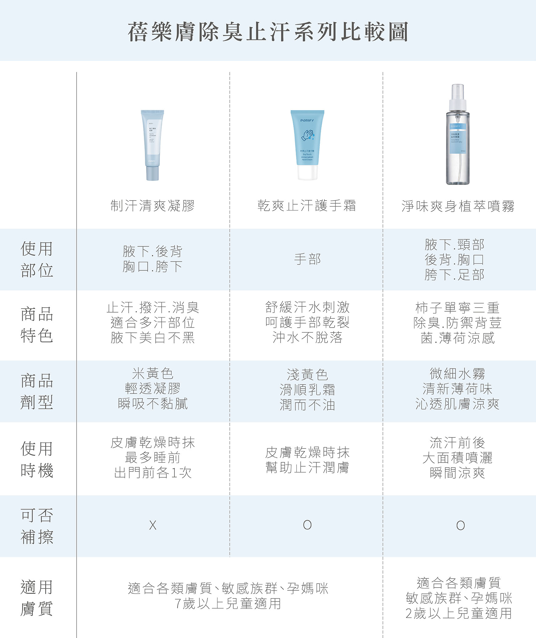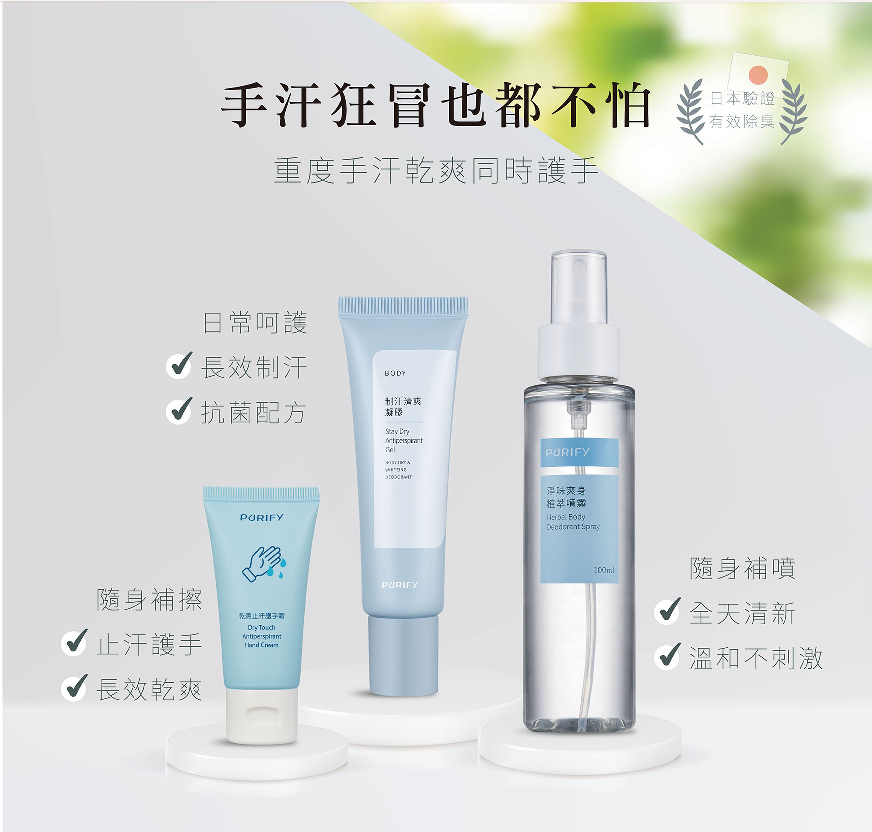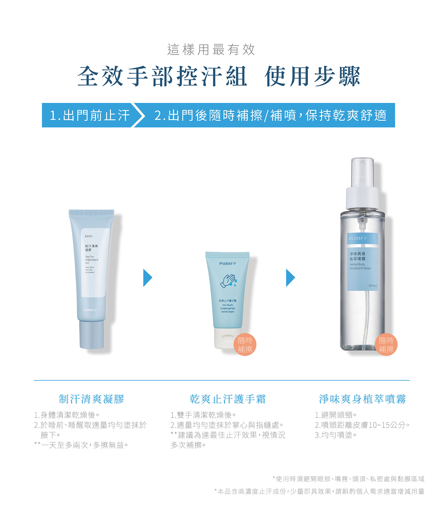 手部容爆汗者,建議可以選用 【全效手部控汗組】內含【乾爽止汗護手霜】、【制汗清爽凝膠】,以及【淨味爽身植萃噴霧】,可針對手部爆汗達到舒爽的效果。