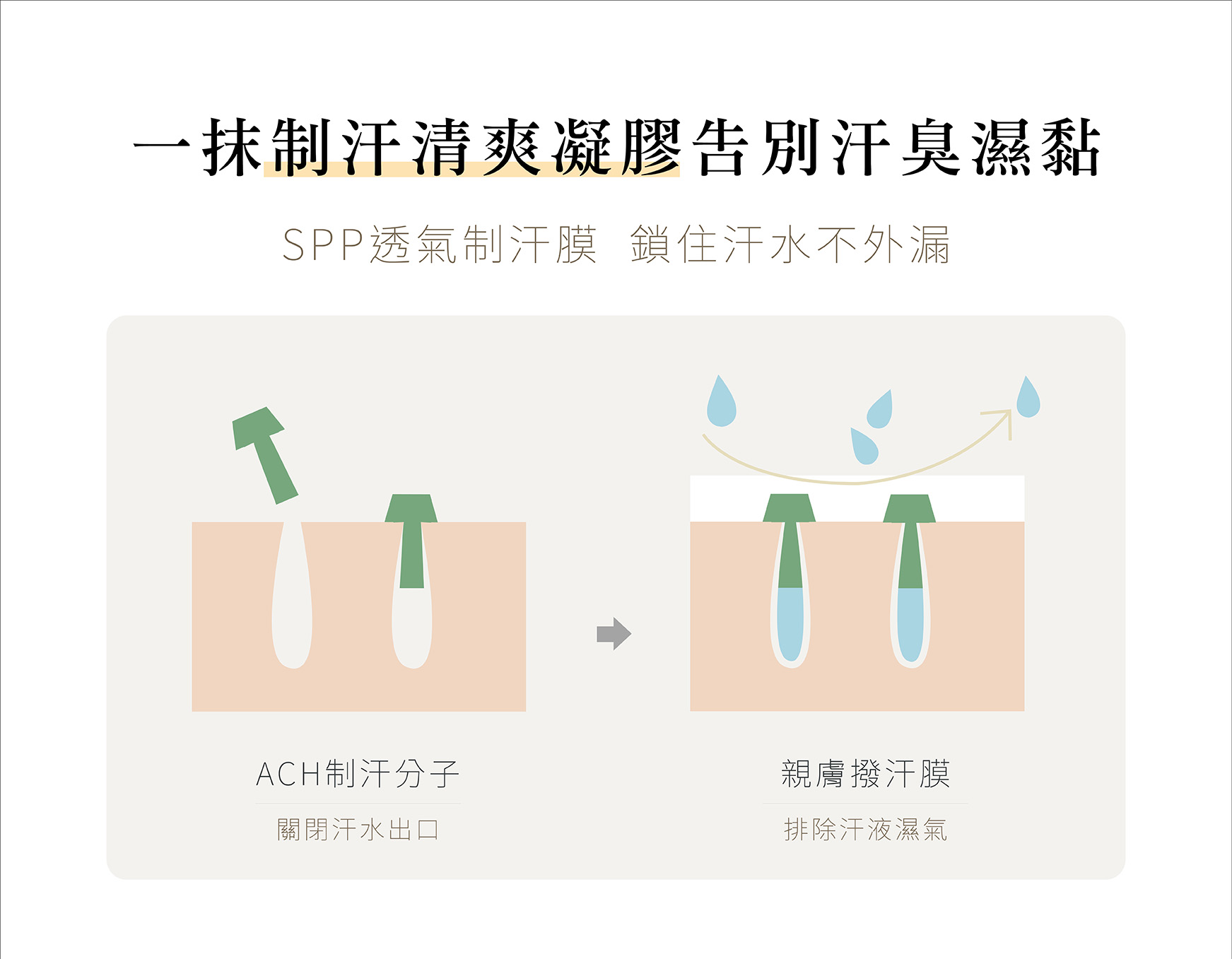 質地很像矽膠親膚成分,能達到24小時長效制汗,日本還有實驗證實,即使游泳塗抹在腋下,也不怕剝落有效制汗。