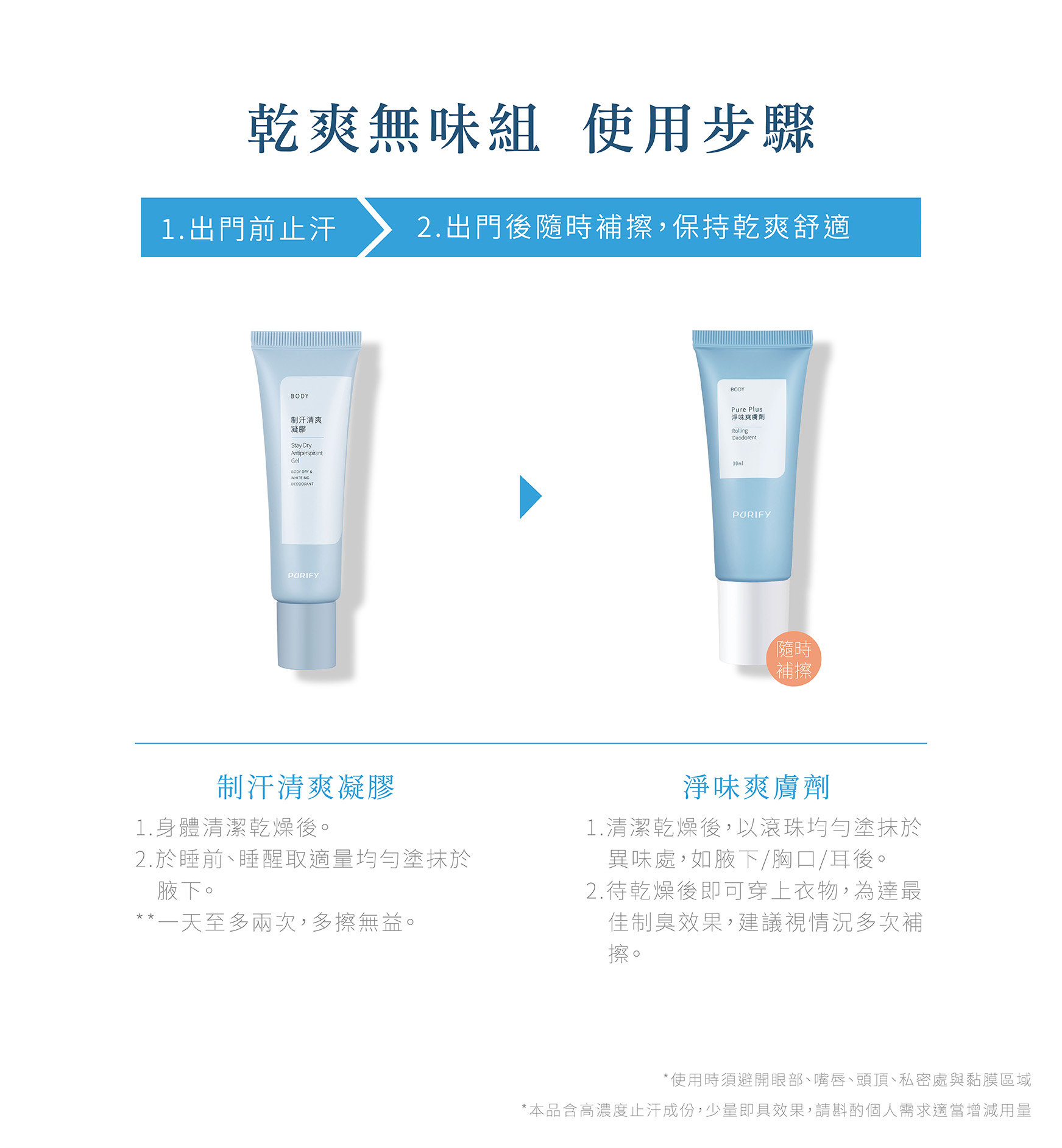 塗抹制汗系列,皆需在皮膚完全乾燥,且未出汗下使用才有效哦!