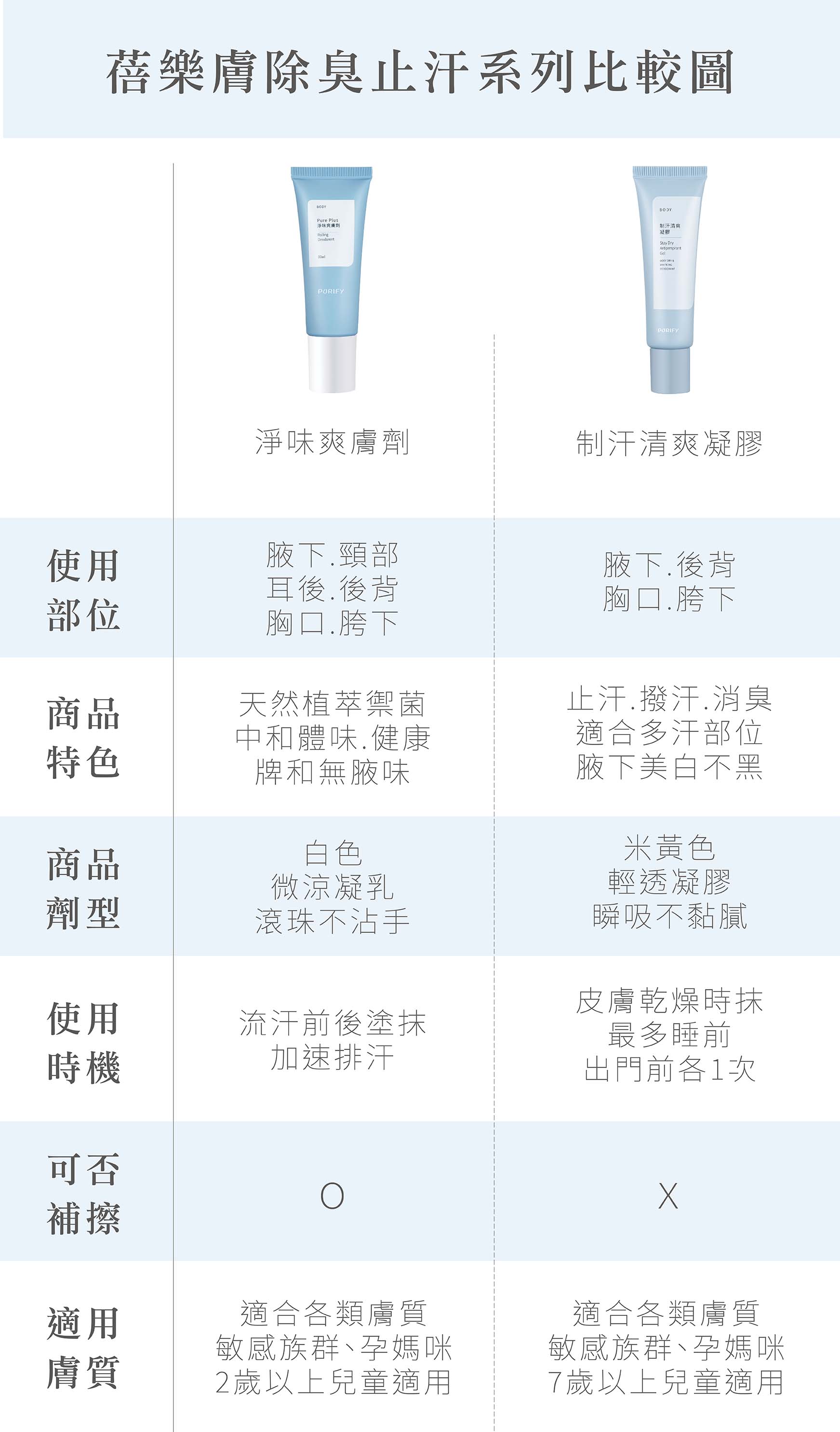 蓓樂膚制汗系列採用的鋁鹽制汗劑,已被使用超過50年,為一種安全能控制體臭的方式,並無相關證據顯示止汗劑與健康有疑慮喔。